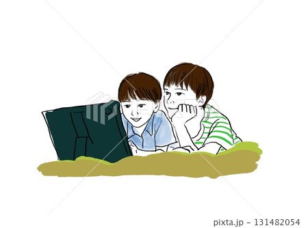 一位父親在教一個男孩在平板電腦上學習的插圖