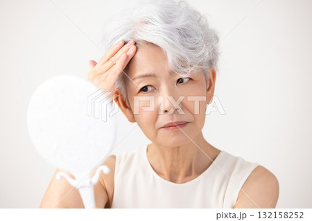 頭髮花白的老年婦女擔心自己的髮際線