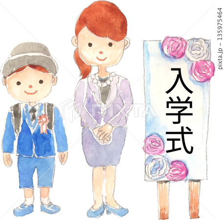 向量圖:一位母親和男孩站在入口儀式標誌前