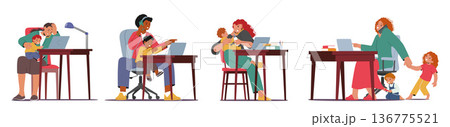 Multitasking Business Mother Characters Skillfully Balancing Work On Laptops While Holding Their Children