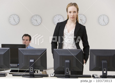 Businesswoman behind row of computers