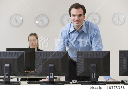 Businessman behind row of computers