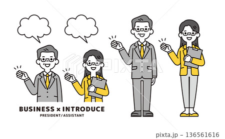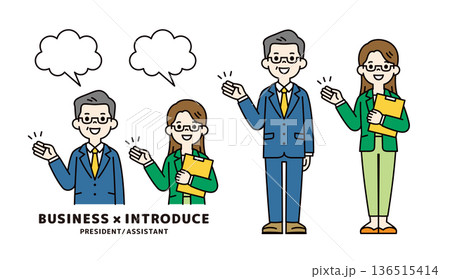 對話氣泡以及一組上半身和全身向量插圖,描繪了一位高級總裁和秘書進行講解和解釋。