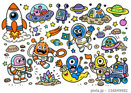 Cartoon astronaut, alien, rocket, spaceship, planet, and robot in colorful outer space adventure
