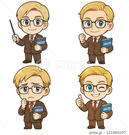 戴眼鏡、穿西裝、手拿教科書的外國英語老師(真人大小:4種姿勢)