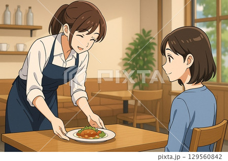 咖啡館裡提供食物的女工作人員(動漫風格)