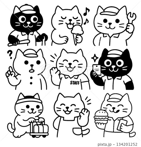 Cat cartoon character set, various jobs, happy and expressive, black and white illustration