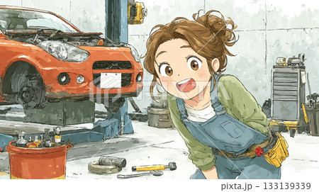 太棒了!一幅民間藝術風格的繪畫,描繪了一位機械師和他的汽車。