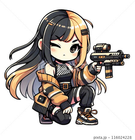 一個金色和黑色頭髮的女孩拿著槍的插圖