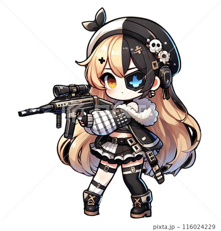 一個戴著眼罩、半黑半金髮的女孩拿著槍。