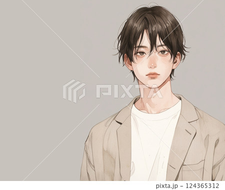 水彩風格插畫|面向前方的男子(自然頭髮、白色 T 卹)