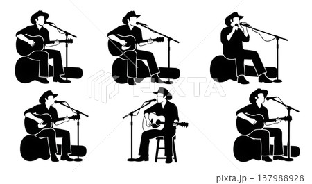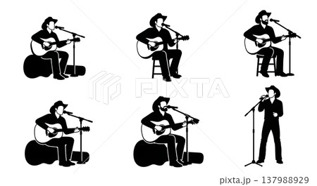 Black Solid Country Musician Poses Set of Six on White Background