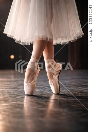 Professional ballet dancer feet in pointe shoes on wooden floor