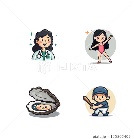 Adorable cartoon illustration featuring a doctor, ballerina, oyster with pearl, and baseball player. Perfect for children's content and cute designs.