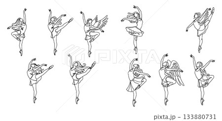 Elegant Ballerinas in Dynamic Poses, Continuous Line Drawing Style, Performing Graceful Dances, with Wings