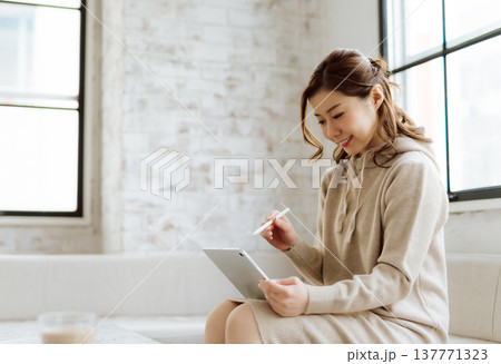 一位女士坐在沙發上,看著平板電腦,側臉特寫。