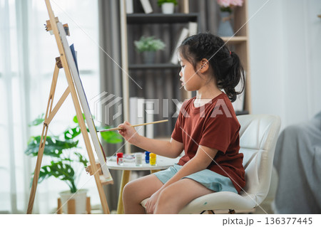 Young girl engaged in creative painting activity at home, showcasing artistic talent with watercolor palette and easel in a cozy interior setting