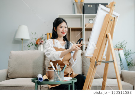 Asian Female painter do artwork in art workshop, painting supplies, oil pastels, two canvas easel, creative space