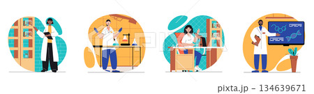 Laboratory concept with people scenes set in flat web design. Bundle of character situations with scientists experimenting and making scientific tests or medical analysis in lab. Vector illustrations.