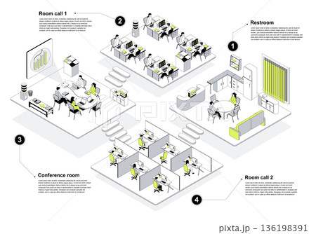 Call center 3d isometric concept in outline design for web. People working in isometry rooms as technical support operators in office with work areas and rest rooms interiors. Vector illustration.