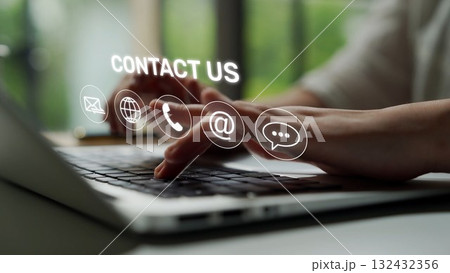 Contact us or the customer support hotline to connect. Businessman touching on virtual screen contact icons. Connecting line, email, AI chat, internet.