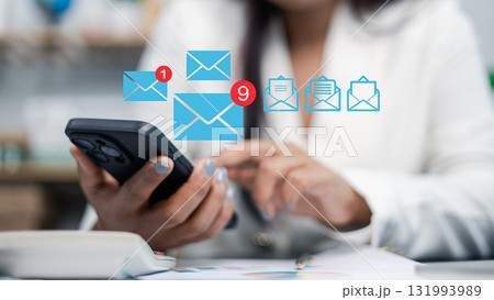Businesswoman using smartphone with email notification icons, digital communication and online messaging concept