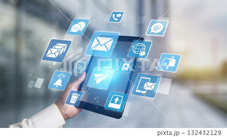 Businessman hand holding smartphone with digital chat and email icons, communication online messaging, social media, mobile marketing, and modern customer engagement technology.