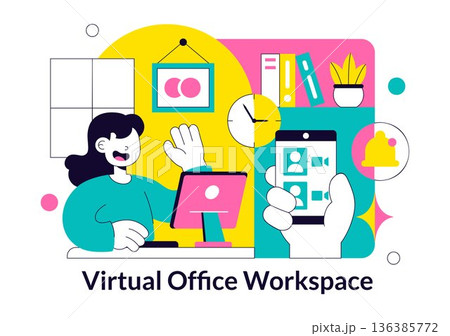 Virtual Office Workspace Vector Illustration For Remote Work Business Technology Concept In Modern Digital Flat Style Background