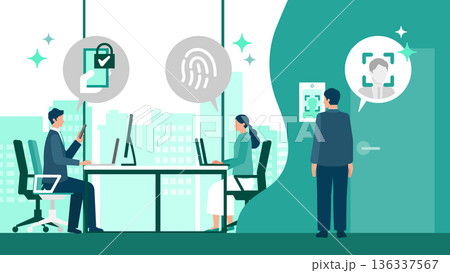 一套展示企業安全措施的插圖,包括人臉辨識和生物辨識認證在門禁控制中的應用。