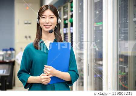 資料中心裡,一位面帶微笑的女工程師戴著耳機,拿著寫字板。