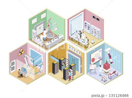 Laboratory 3d isometric rooms concept in isometry graphic design for web. People doing research in genetics, pharmaceutical and physics departments, using data center servers. Vector illustration.