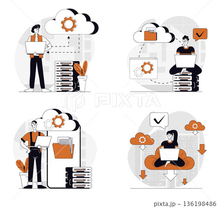 IT specialists administrate cloud service, data storage. Hosting platform. Big data processing, transferring. Online computing technology. Software solutions to share informations on digital network