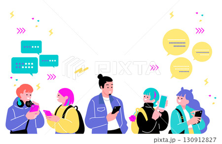 流行且色彩鮮豔的 Z 世代年輕人手持智慧型手機的插圖