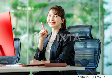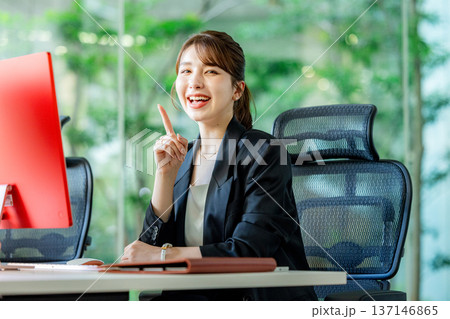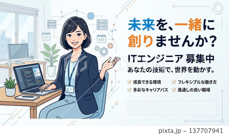 IT工程師招募橫幅插圖:一位微笑的女士在辦公桌前工作,提供指導。