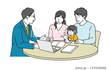 插畫素材:一對年輕夫婦帶著孩子諮詢,一位身穿西裝的男士正在講解