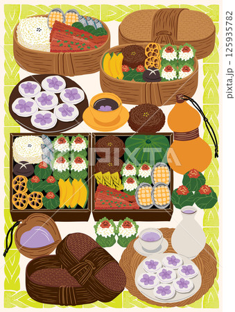 Traditional Korean Lunch Box for Spring Picnic. Vector Illustration Template design for stickers and icons.