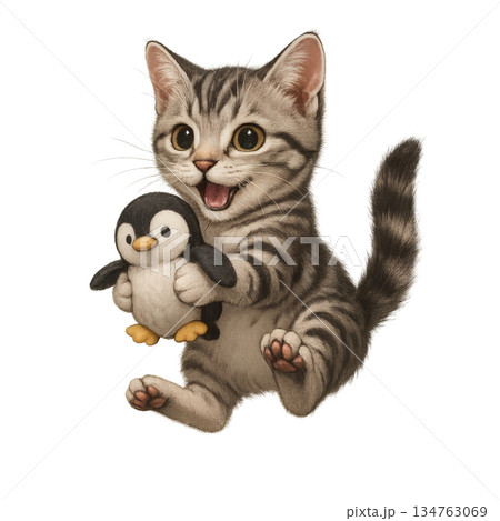 一隻可愛的小貓抱著一隻企鵝毛絨玩具的插圖