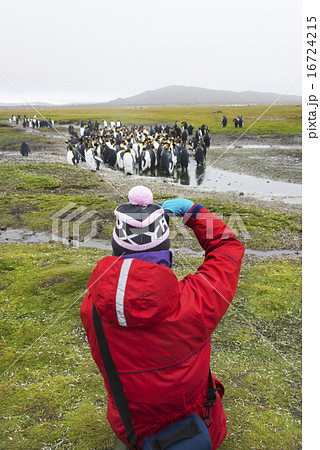 A person in an orange jacket photographing king penguin adults and chicks on South Georgia island.