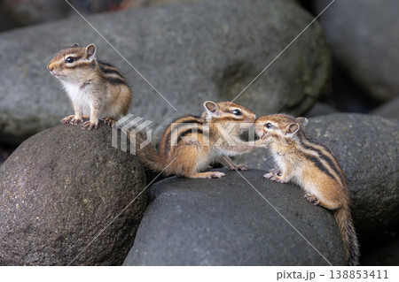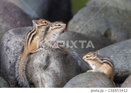 一群Ezo花栗鼠在岩石上玩耍。