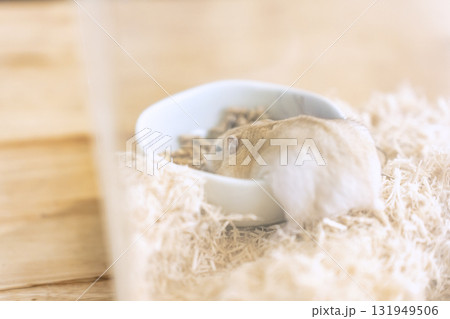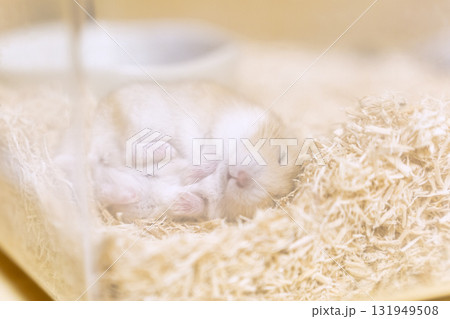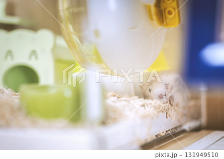 White hamster resting in colorful bedding at home