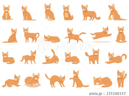 Black and white vector illustration of two Abyssinian cats in sitting and standing poses. Detailed fur texture, perfect for prints, logos, or design work. Pet, Animal.