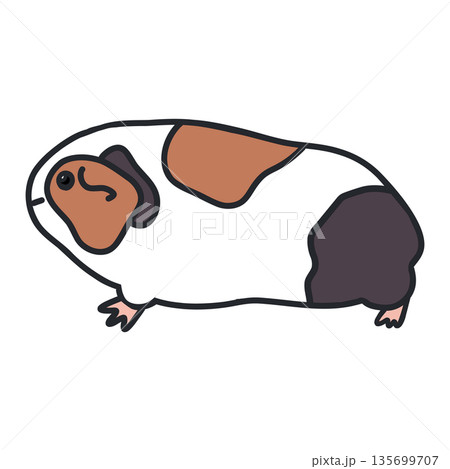 一隻棕、黑、白相間的豚鼠側面圖。手繪插圖,線條粗獷。