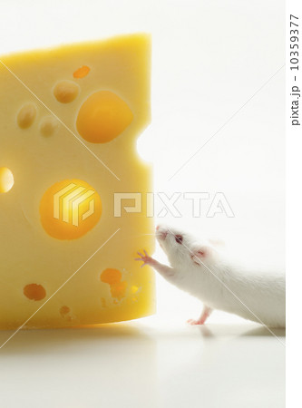 Studio shot of white mouse sitting on top of slice of cheese