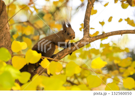 北海道松鼠棲息在一棵長滿秋葉的樹上