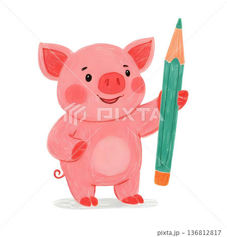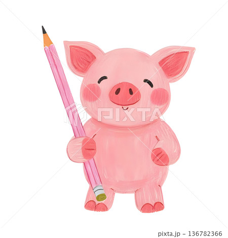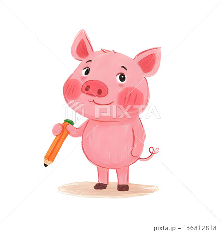 Cute pink pig holding pencil cartoon illustration isolated background simple