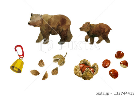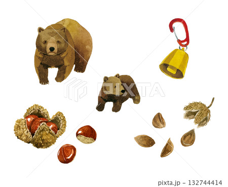 一組棕熊、熊愛吃的堅果和驅熊鈴鐺。手繪水彩插圖。