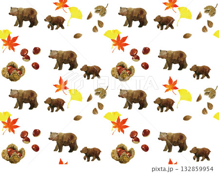 熊、堅果和樹葉的無縫圖案。手繪水彩插畫背景素材。