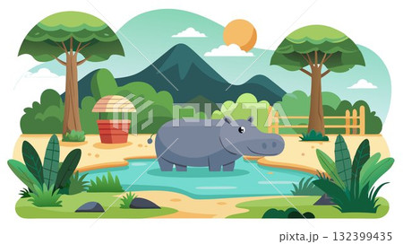 夏日小屋和河馬,卡通風格