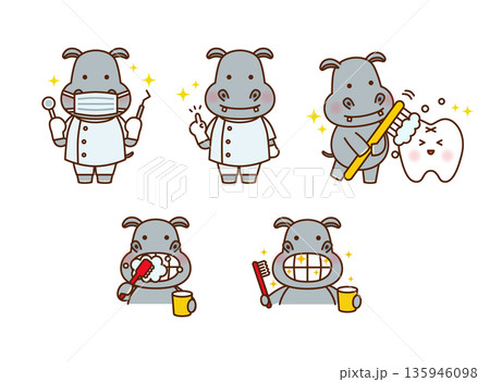 可愛的河馬牙醫和刷牙插圖套裝(牙科、蛀牙預防、兒童適用)