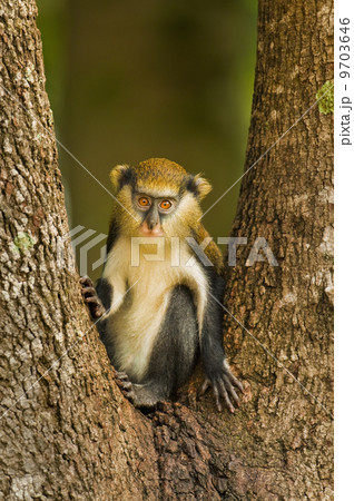 Mona monkey, Cercopithecus mona, Boabeng-Fiema Monkey Sanctuary, Ghana